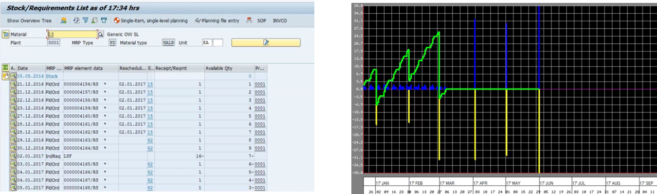 In the graphical display of MD04 we can see that there is a forecast for the next five months. We can also see that the MRP Run has created orders to fulfill those forecasts. Note that MRP generates orders with their latest possible delivery date standing just before the forecast is due (it does assume unlimited capacity).