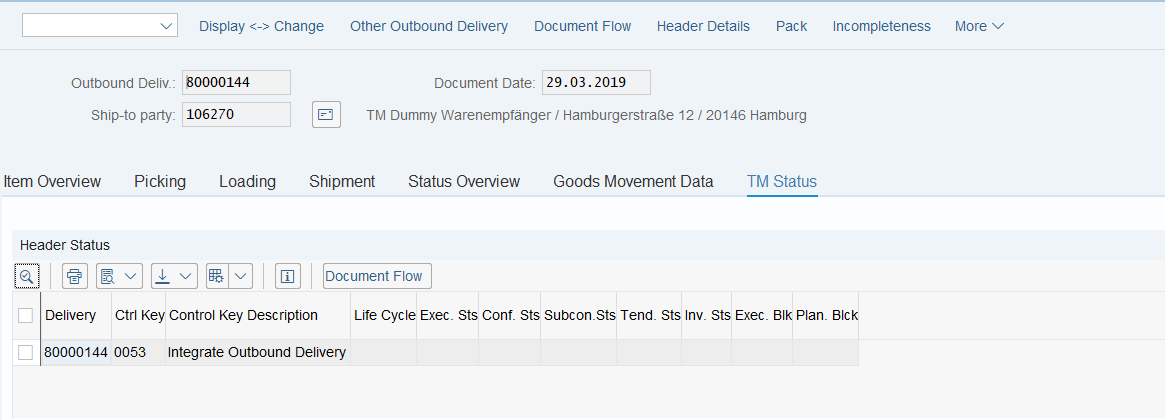 The Delivery has the right attributes meaning Shipping Point/Delivery Type and Shipping condition. A right integration customizing can be verified by the fact, that the delivery finds the right control key in the TM Status-Tab: