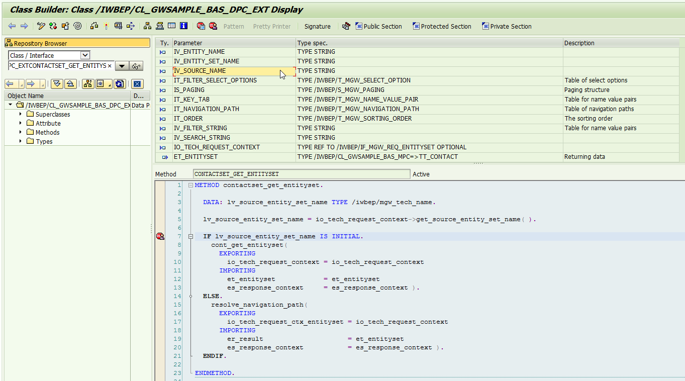 Now let’s first set a breakpoint in the method CONTACTSET_GET_ENTITYSET of the class /IWBEP/CL_GWSAMPLE_BAS_DPC_EXT. You can navigate there directly from SEGW (see screenshot above), or just use SE80.