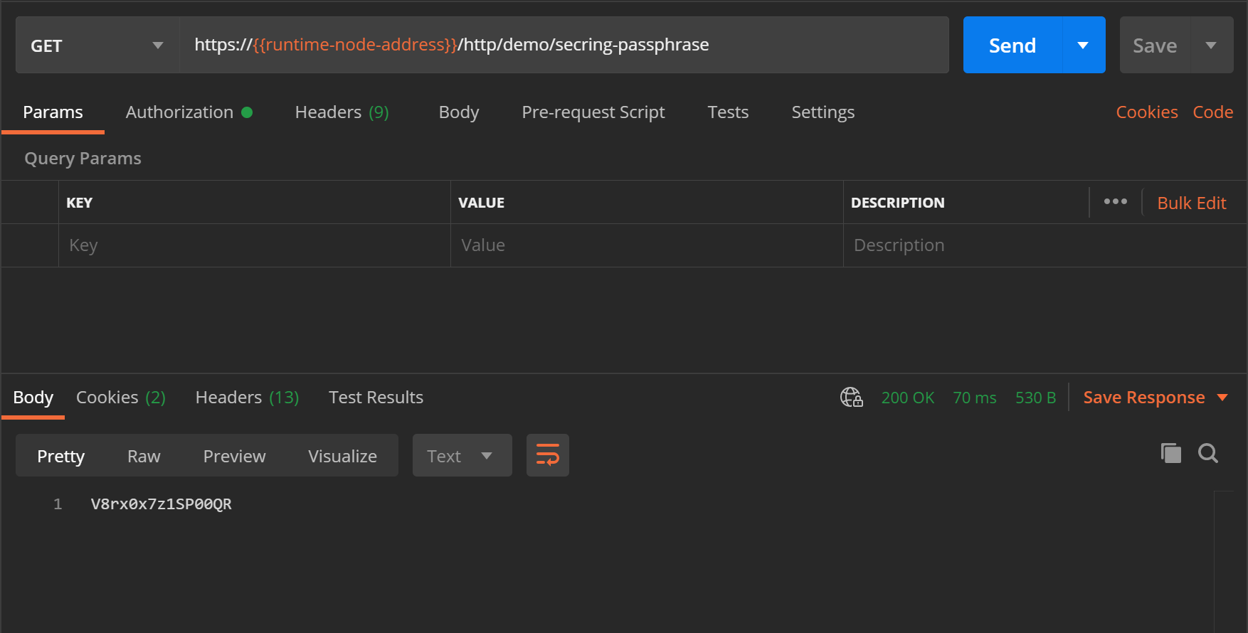 - Invoke a required service operation – in the particular case, this is a get password operation applied to the secret keyring. The call returns the passphrase of the secret keyring in plain text. To keep this demo simple, output of the call will be issued to a response message body (payload).