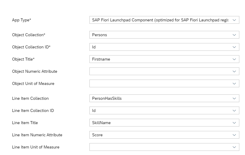 Bind the Object Collection to the “Persons” entityset and the “Firstname” property to the title. In “Line Item Collection” use the association with the skills of a person. Each line will show the name of the skill with the score.