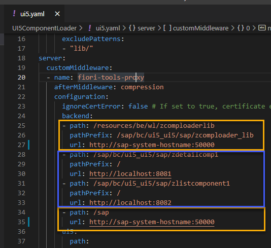 In the UI5 server middleware proxy configuration of the Component Loader, I configured to load the library and the OData service (in yellow) from the SAP system and the new Components from localhost using the defined port (in blue). The path of the components needs to be the path of the app on the SAP server. The proxy will forward it to the localhost and change the path to the pathPrefix: