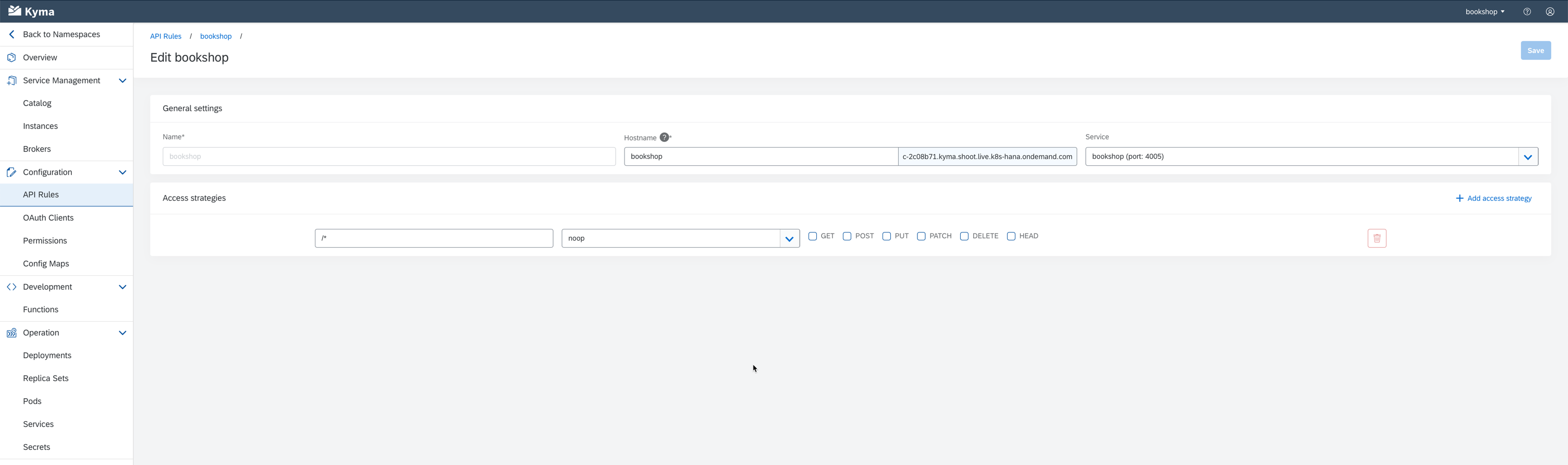 default namespace and Kyma will spin up the pods, service and API Rule for you automatically.