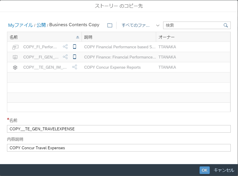 コピー対象のストーリー「SAP__TE_GEN_TRAVELEXPENSE(SAP Concur Travel Expenses)」を選択して、「コピー先」を選択します。