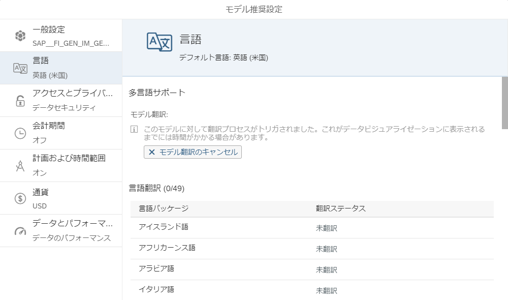 翻訳対象の「モデル推奨設定」で言語メニューから「モデル翻訳の要求」を選択することにより、SAP Analytics Cloudでサポートされている言語(49言語)への翻訳が可能となります。モデルに公開ディメンジョンが含まれている場合、公開ディメンジョンの翻訳も可能となります。