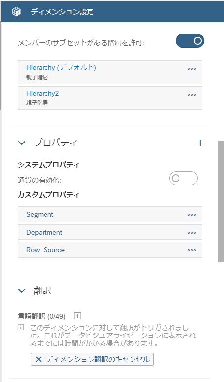 公開ディメンジョンの場合、2の手順で同時に翻訳設定が有効化されます。ディメンジョンは各ディメンジョン設定で有効化およびキャンセルが可能です。