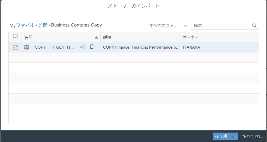 ストーリーのインポートのダイアログでコピーしたストーリーを選択し、インポートをクリックします。